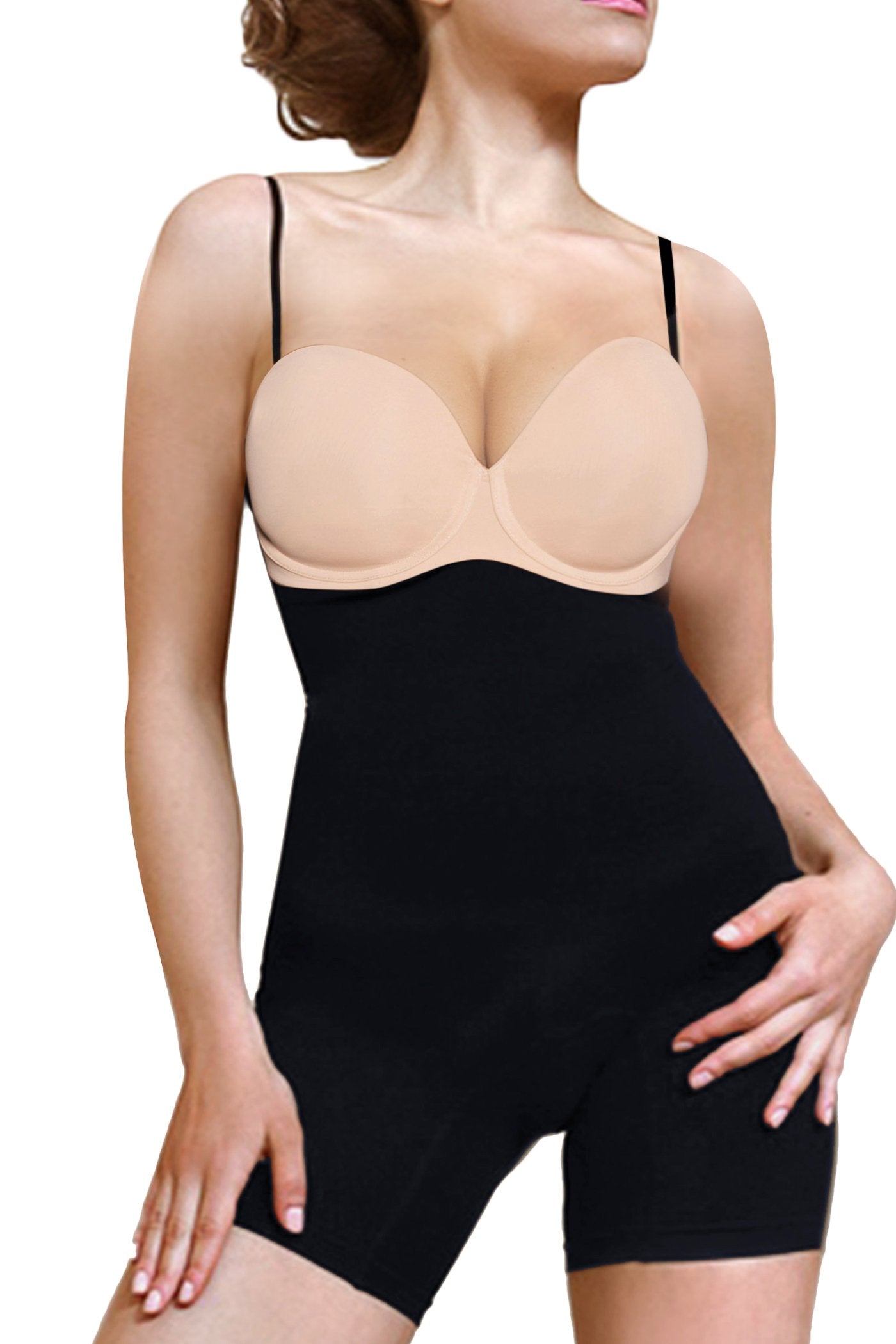 This full body shaper provides powerful overall shaping to help you look incredible under clothes. With an underbust cut and mid thigh shorts finish, this is our strongest shaper with the most coverage.